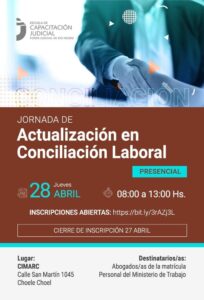 La Escuela de Capacitación Judicial brindará en Choele Choel una Jornada de Actualización en Conciliación Laboral destinada a profesionales de la abogacía y personal del Ministerio de Trabajo de la Segunda Circunscripción Judicial.