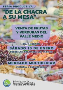Luego del convenio firmado entre el Municipio San Antonio y el Municipio de Choele Choel, el sábado 13 de enero de 9:00 a 14:00 hs, se realizará la Feria Productiva “De la Chacra a su Mesa” en la que productores del Valle Medio visitarán la localidad sanantoniense con el objetivo de la venta de frutas y verduras directos la cosecha.