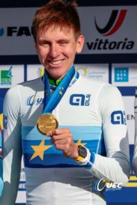 Ningún corredor logró seguir su impresionante ritmo: Remco Evenepoel, campeón olímpico de ruta y contrarreloj y nuevo campeón de Europa de contrarreloj, intentó perseguirlo antes de rendirse, terminando en segundo lugar, como hizo en el Campeonato del Mundo.