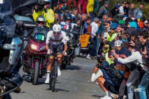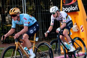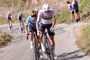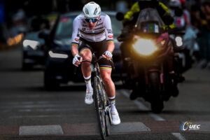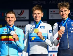 Ningún corredor logró seguir su impresionante ritmo: Remco Evenepoel, campeón olímpico de ruta y contrarreloj y nuevo campeón de Europa de contrarreloj, intentó perseguirlo antes de rendirse, terminando en segundo lugar, como hizo en el Campeonato del Mundo.