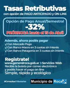 En este mismo sentido, el Municipio reitera su invitación a los contribuyentes a registrarse para recibir la boleta de manera electrónica, ingresando al sitio web www.generalroca.gob.ar, en el apartado “Servicios Web”.