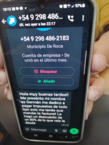 General Roca – Se detectaron falsos cobradores de impuestos municipales que toman contacto a través de un número de whatsapp, imitando identificación municipal.