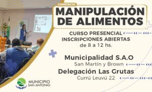 Asimismo, se informa que continúan abiertas las inscripciones para el Curso de Manipulación de Alimentos presencial que se realizará los días 4, 5 y 6 de julio, de 14:30 a 18:30 también en la Casa de la Historia y la Cultura de Las Grutas.