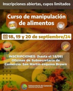 La Subsecretaría de Control Comercial llevará adelante nuevas fechas para brindar el Curso de Manipulación de alimentos, que tendrá lugar los días 18, 19 y 20 de septiembre de 13:15 a 17:00 hs en el Salón de Sesiones del Concejo Deliberante, ubicado en la Municipalidad de San Antonio Oeste – Brown 286.