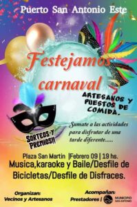 Organizados por vecinos y artesanos y con el acompañamiento del Municipio San Antonio y prestadores de servicios, te invitamos a festejar los Carnavales 2024 en la Plaza San Martín del Puerto San Antonio Este.