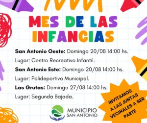 El Municipio San Antonio recuerda las fechas establecidas de los festejos por el “Día de las Infancias” en los tres centros urbanos, invitando a juntas vecinales, instituciones, agrupaciones y todos aquellos que deseen sumarse a la organización del evento para hacer de este una fiesta general.