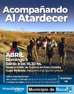 – Entre ocaso y estrellas: Jueves 2 de abril a las 18 hs – Punto de encuentro: Oficina de Turismo en ex estación del ferrocarril (requiere inscripción previa)