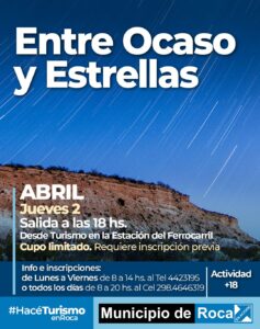 – Entre ocaso y estrellas: Jueves 2 de abril a las 18 hs – Punto de encuentro: Oficina de Turismo en ex estación del ferrocarril (requiere inscripción previa)
