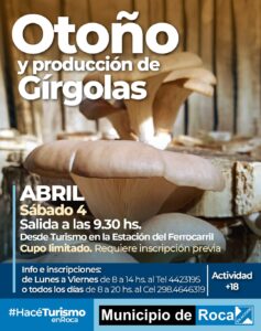 – Otoño y producción de gírgolas: Sábado 4 de abril a las 9:30 hs – Punto de encuentro: Oficina de Turismo ex estación de ferrocarril (requiere inscripción previa)