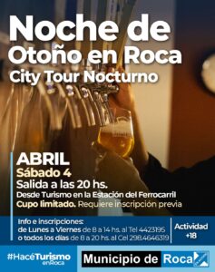 – Noche de otoño en Roca, city tour nocturno: Sábado 4 de abril a las 20 hs – Punto de encuentro: Oficina de Turismo ex estación de ferrocarril (requiere inscripción previa)