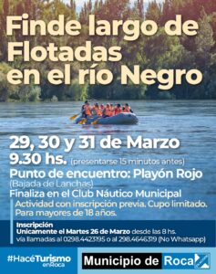 El Municipio de Roca, a través de la Dirección de Turismo, invita al público a participar de las nuevas salidas en balsa. Para este fin se semana largo se ofrece una actividad náutica donde se podrá apreciar el paisaje del ANP Paso Córdoba a través de un recorrido a remo, con acompañamiento de un guía especializado.
