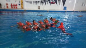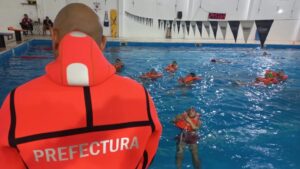 En horas de la mañana los alumnos de la Escuela de Formación y Capacitación para el Personal de la Marina Mercante de la Prefectura San Antonio Oeste, llevaron a cabo en el Natatorio Municipal las prácticas exigibles para la obtención de las distintas titulaciones y reválidas – NACIONALES E INTERNACIONALES – que se expiden a los tripulantes de los buques Pesqueros, Mercantes, Artesanales, Turísticos, Científicos, Petroleros, Gaseros y Quimiqueros, para poder integrar las distintas dotaciones que conforman los navíos.