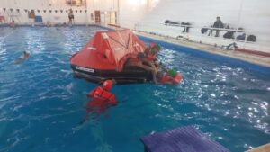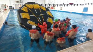 La actividad consistió en complementar la teoría desarrollada en el aula, aplicando técnicas de flotación y desplazamiento individual, grupal, ascenso y descenso a las balsas salvavidas en superficie, como así también prueba de natación.