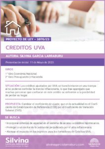 La Senadora Silvina García Larraburu presentó un Proyecto de Ley para cambiar la fórmula de ajuste de los créditos UVA en favor de quienes se encuentran endeudados. Se propone cambiar el coeficiente de ajuste, que en la actualidad es el Coeficiente de Estabilización de Referencia (CER) por el Coeficiente de Variación Salarial (CVS), esto debido que lamentablemente el coeficiente UVA aumentó un 391% en el lapso 2016-21, en tanto los salarios quedaron atrás al aumentar un 323% en el mismo lapso.