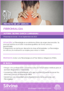 La Senadora Silvina García Larraburu presentó un proyecto de Ley con el objetivo de incluir a la Fibromialgia en el Plan Médico Obligatorio. Esto permitirá otorgar a los profesionales y pacientes todas las herramientas médicas para un acertado diagnóstico y tratamiento.
