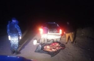 Luego de una inspección de la documentación y de la camioneta se divisó que en la caja de la misma se encontraban bultos cubiertos con nylon con carne bovina sin ninguna documentación ni habilitación de transporte.