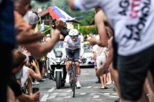 156 corredores tomaron la salida en la decimosexta etapa del Tour de Francia 2023, una contrarreloj individual de 22,4 kilómetros entre Passy y Combloux, con dos cotas en su recorrido: la Côte de Cascade de Coeur (no puntuable, km 4,1) y la Côte de Domancy (2ª, km 18,9). No fue de la partida Matteo Jorgenson (Movistar Team), lesionado. Abrió el concurso a las 13:05 el danés Michael Morkov (Soudal-Quick Step), primer mejor tiempo en meta con 39’46”. Sucesivamente registrarían nuevas mejores marcas Axel Zingle (Cofidis), Gianni Moscon (Astana Qazaqstan), Dries Devenyns (Soudal-Quick Step), Nikias Arndt (Bahrain Victorious) y Mads Pedersen (Lidl-Trek), hasta que el campeón nacional francés Rémi Cavagna (Soudal-Quick Step) marcó un crono de 35’42” que le sirvió para campear en lo más alto de la tabla durante más de dos horas. En este lapso de tiempo, sólo Stefan Küng (Groupama-FDJ) logró superarle en el intermedio de Passy Chef-Lieu (km 7,1), para posteriormente ir a menos y acabar con casi un minuto de retraso respecto al ‘TGV de Clermont-Ferrand’.
