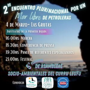 Las Asambleas socioambientales de la provincia de Río Negro nucleadas en Asambleas del Curru Leufu llaman a convocarse en la localidad de Las Grutas este 04 de marzo al “2° Encuentro Plurinacional por un Mar Libre de Petroleras”, mientras que el día 5 se realizará el “5° Plenario de las Asambleas de la Curru Leufu”.
