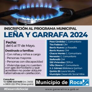 General Roca – Desde el próximo lunes 6 hasta el 17 de mayo inclusive, se llevarán adelante las inscripciones para el Programa Municipal de Leña y Garrafa 2024.