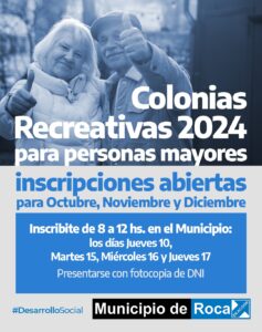 General Roca – Se extiende el plazo de inscripción a la Colonia Recreativa para Personas Mayores que llevará a cabo el Municipio de Roca en los meses de octubre, noviembre y diciembre.