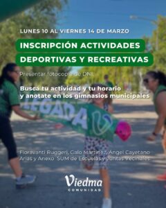 La Municipalidad de Viedma informa que hasta el viernes 14 de marzo estarán abiertas las inscripciones para las actividades deportivas anuales destinadas a niñas, niños, adolescentes, adultos y adultos mayores.