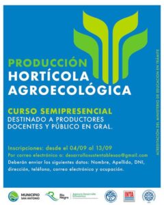 Esta capacitación semipresencial destinada a productores, docentes y público en general, tiene la organización por parte del Instituto Nacional de Tecnología Agropecuaria, la Subsecretaría de Desarrollo Sustentable, UNComa, CIMAS y la Agencia de Desarrollo Económica de Río Negro.