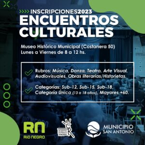La Dirección de Cultura del Municipio San Antonio informa que ya se encuentran abiertas las inscripciones para integrar los Encuentros Culturales Rionegrinos en los rubros de música (canto solista, grupo musical, hip hop, freestyle, canto coral, colectivo, solista, instrumental), danza (grupo dúo o pareja individual), teatro (títeres, individual o unipersonal), artes visuales (pintura y/o dibujo, fotografía, mural y artesanías), audiovisual (videominuto, cortometraje, spot) y obras literarias (historietas, poesía, humor gráfico, cuento).