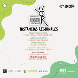 La Secretaría de Estado de Cultura, conjuntamente con la coordinación de la Dirección de Cultura del Municipio San Antonio, llevarán adelante el próximo martes 15 de agosto (con horario y lugar a confirmar) las instancias regionales de los Encuentros Culturales Rionegrinos, en este caso, la región Atlántica.