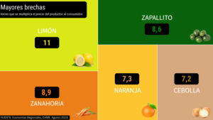 Por quinto mes consecutivo, el limón fue el alimento con mayor brecha entre el productor y el consumidor. Sus precios aumentaron 6,7% en destino, mientras que en origen tuvieron una suba del 20,3%, debido a una leve recuperación de los precios tras la sequía. Es decir, a pesar de que la diferencia campo-góndola continúa en descenso (de 12,3 veces en julio a 11 en agosto), el limón sigue siendo el producto con mayor disparidad entre ambos extremos de la cadena de valor.