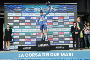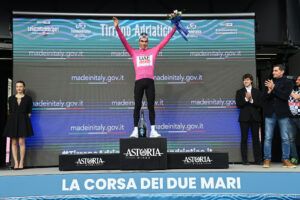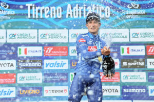 celebrates on the podium as a Leader of the race during the 59th Tirreno-Adriatico 2024, Stage 2 a 198 km from Camaiore to Follonica on March 05, 2024 in Camaiore, Tuscany, Italy. (Photo by Gian Mattia D’Alberto / LaPresse )