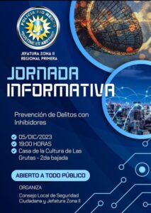 El Consejo de Seguridad Ciudadana y la Jefatura Zona II invitan a la comunidad en general a la jornada informativa en la “Prevención de Delitos con Inhibidores”, que se llevará adelante este martes 05 de diciembre a las 19:00 hs en la Casa de la Historia y la Cultura de Las Grutas, Segunda Bajada.