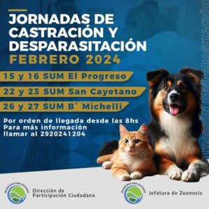 La Jefatura de Zoonosis y la Dirección de Participación Ciudadana recuerdan que mañana jueves 15 y viernes 16 de febrero, a partir de las 8:00 y hasta las 10:00, en el SUM del barrio El Progreso de San Antonio Oeste se llevarán adelante jornadas de castraciones masivas y desparasitación interna/externa, destinadas a perros y gatos.