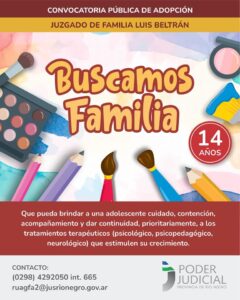 Para mayor información, pueden comunicarse con el Registro Único de Aspirantes a Guarda con Fines Adoptivos al teléfono (0298) 4292050 int. 665 en el horario de 7.30 a 13.30 horas en días hábiles y/o por correo electrónico a ruagfa2@jusrionegro.gov.ar