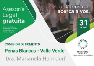 La titular de la defensoría de la ciudad de Catriel, Marianela Hanndorf se trasladará el miércoles (31/05) a Peñas Blancas para brindar asesoramiento jurídico a los habitantes de ese paraje y de Valle Verde.