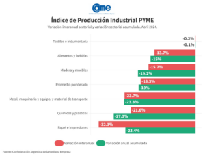 La actividad industrial pyme experimentó otro fuerte descenso en el mes de abril, marcando una baja anual de 18,3%, las más profunda de los últimos 3 meses. Con ese resultado, el primer cuatrimestre del año cierra con una merma de 19% en comparación con el mismo período de 2023. Sin embargo, en la comparación mensual, la producción repuntó 3,1% en la medición desestacionalizada.