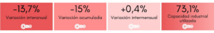 El sector registró un declive de 13,7% anual a precios constantes en abril y un aumento de 0,4% en la comparación mensual. Para el primer cuatrimestre del año acumula una baja de 15% anual. Las industrias operaron con 73,1% de su capacidad instalada (vs. 73,3% en marzo).