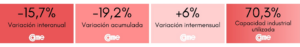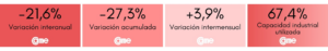 El sector experimentó otra significativa contracción de 21,6% anual a precios constantes, pero combinada con un aumento de 3,9% en la comparación mensual. En los primeros cuatro meses del corriente año, la producción lleva un declive de 27,3%, contra el mismo periodo 2023. Durante este mes, las industrias operaron con 67,4% de su capacidad instalada (65,6% en marzo).