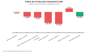 La producción de la industria manufacturera pyme bajó 6,4% en septiembre frente al mismo período del año pasado. Es el cuarto mes consecutivo en que la actividad se retrae. En total, acumula una caída de 0,8% en los primeros nueve meses del año. En la comparación mensual, la producción se mantuvo sin cambios.