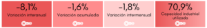 La producción tuvo una significativa contracción anual de 8,1% a precios constantes, acumulando una disminución de 1,6% en el año. En la comparación mensual, se registró una caída de 1,8%. Las industrias operaron al 70,9% de su capacidad instalada, casi un punto abajo del 71,7% de agosto.