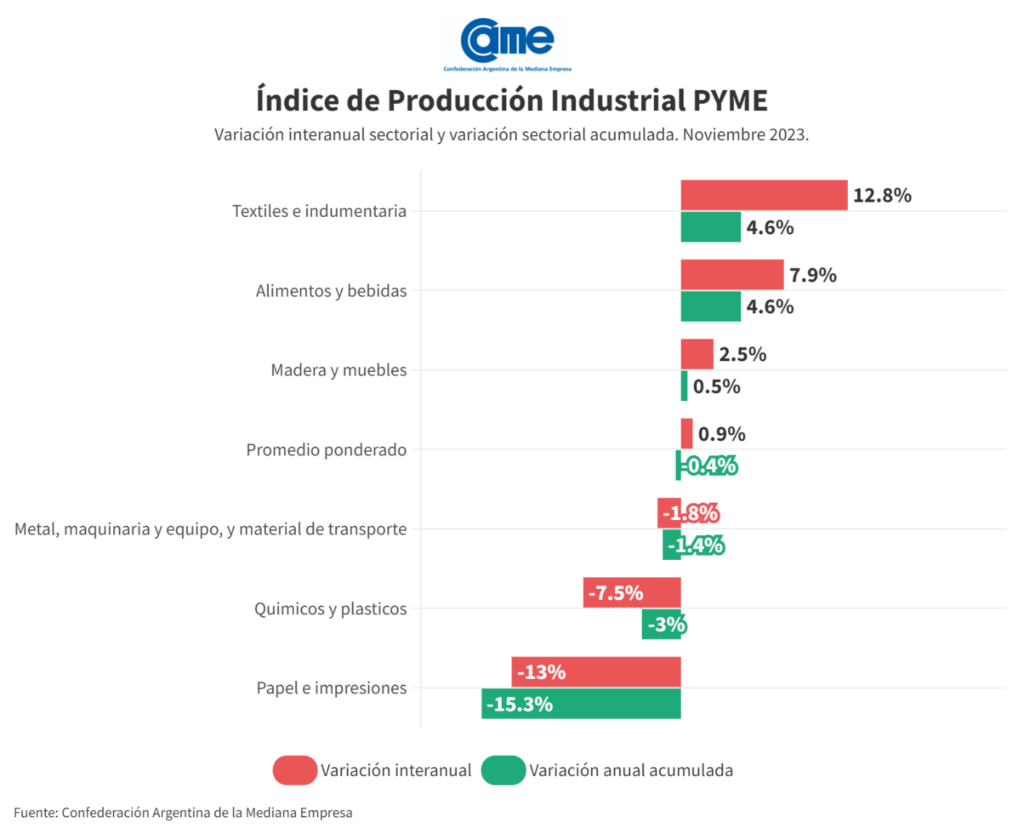 En el acumulado del año, la mejor nota sectorial la tuvieron “Alimentos y Bebidas” y “Textil e Indumentaria”, ambos con un alza de 4,6% frente al periodo enero-noviembre de 2022, mientras que la peor la tuvo “Papel e Impresiones” con un desplome del 15.3%.