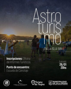 Además, el jueves 26 a las 20, Caelum Patagonia y la Dirección de Turismo de Villa Regina encabezarán una actividad de astroturismo en la Escuela de Canotaje de la Isla 58, en la que se podrán observar los maravillosos astros del cielo nocturno vallenato mediante telescopios especializados, con una charla informativa por parte de los profesionales de la empresa organizadora y degustación de productos regionales para englobar una noche mágica.