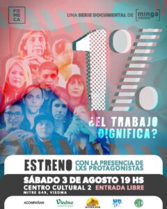“1%, ¿El trabajo dignifica?” es una serie documental realizado por la Cooperativa Minga de la comarca Viedma – Carmen de Patagones que retrata a personas Travestis, Transexuales y Transgénero que habitan la Patagonia Norte y su lucha para conseguir trabajo y garantizar sus derechos. Diez historias, diez capítulos, diez experiencias de vida de personas de Viedma, Allen, Bariloche, Guardia Mitre, Cipolletti y General Roca.