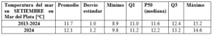 La temperatura en la superficie del mar en Mar del Plata en septiembre de 2024 promedió los 12,1°C, aumentando a lo largo del mes desde el mínimo de 9,8°C registrado el día 5 hasta el máximo de 14,6°C el día 29. Hasta el día 8 la temperatura registró valores inferiores al 25% de los valores más bajos registrados en la serie EOC (Q1=11,0°C); mientras que desde el día 16 las observaciones aumentaron por encima del umbral de los valores más altos registrados históricamente en el mes (Q3=12,4°C), en correspondencia con el aumento de la temperatura del aire en la superficie.
