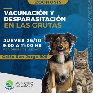 Mañana jueves 26 de octubre, Zoonosis Municipal realizará una nueva jornada de vacunación antirrábica y desparasitación interna/externa destinada a perros y gatos en Las Grutas.