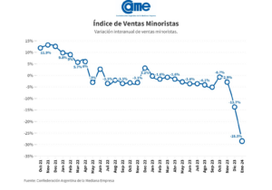 Así surge del Índice de Ventas Minoristas Pymes de la Confederación Argentina de la en Mediana Empresa (CAME), elaborado en base a un relevamiento mensual entre 1.256 comercios minoristas del país, realizado del 1 y 2 de febrero de 2024.