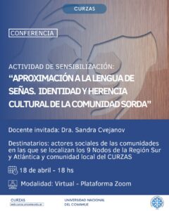 La actividad académica que contará con la participación de la Dra. Sandra Cvejanov, docente invitada de la Facultad de Humanidades de la Unco, se focalizará en el valor Lengua de Señas Argentina (LSA) como sistema de comunicación no hegemónico.