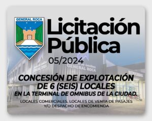 La Municipalidad de General Roca, llama a Licitación Pública Nº 05/2024 correspondiente a la: “Concesión de la explotación de 6 (seis) locales comerciales, con destino a venta de pasajes, despacho de encomiendas y comercios en general ubicados todos ellos en la Terminal de Ómnibus de la Ciudad de General Roca”.