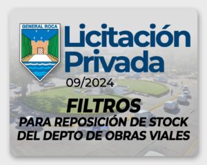La Municipalidad de General Roca llama a Licitación Privada Nº 09/2024, correspondiente a la “Compra de filtros para reposición de stock del departamento de Obras Viales dependiente de la Dirección de Obras Publicas”.