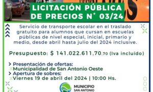 El Municipio San Antonio realiza el Llamado a Licitación Pública N°003/2024, que tiene por objeto la prestación del “servicio de transporte escolar en el traslado gratuito para los alumnos que cursan en las escuelas públicas de nivel especial, inicial, primario y medio, desde el mes de abril hasta el mes de julio inclusive, del ciclo lectivo año 2024”.