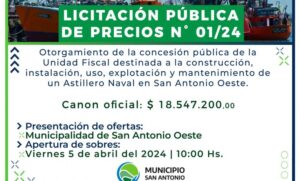 El Municipio San Antonio realiza el Llamado a Licitación Pública N°001/2024, que tiene por objeto el otorgamiento de la concesión pública de la Unidad Fiscal destinada a la construcción, instalación, uso, explotación y mantenimiento de un “Astillero Naval en San Antonio Oeste”.